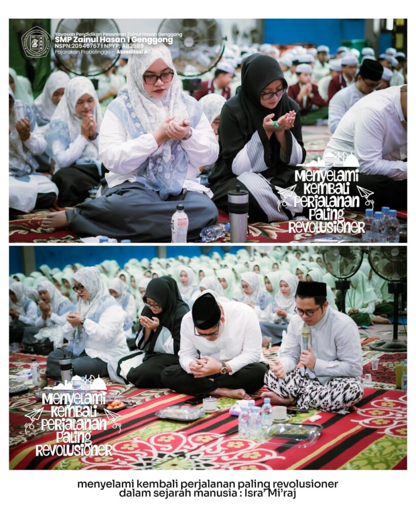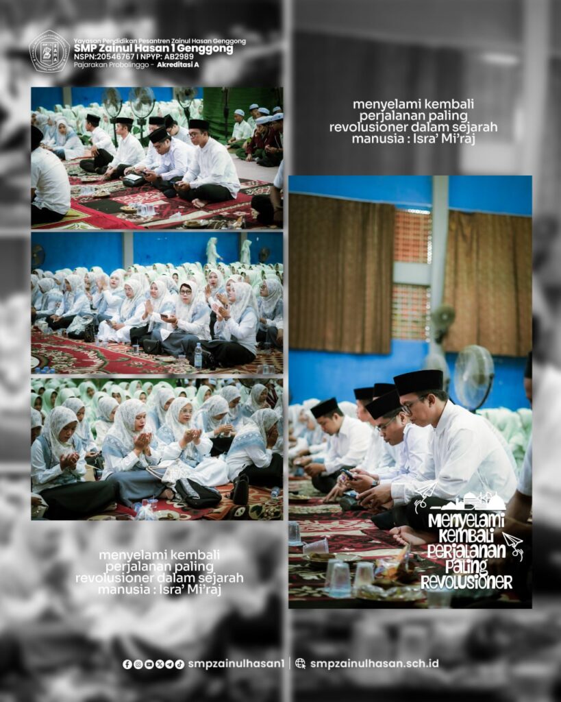 Genggong, SMP Zainul Hasan 1 โ Seluruh keluarga besar SMP ZAHA 1 Genggong menggelar acara peringatan Isra’ Mi’raj Nabi Muhammad SAW 1447 H dengan penuh khusyuk di GOR Damanhuri Romly, pada hari Kamis, 16 Januari 2026. Kegiatan ini bertepatan dengan momentum nasional memperingati peristiwa agung Isra’ Mi’raj yang jatuh pada 27 Rajab 1447 H, di mana umat Islam mengenang perjalanan malam Rasulullah SAW dari Masjidil Haram ke Masjidil Aqsa (Isra’) dan naik ke Sidratul Muntaha (Mi’raj) untuk menerima perintah shalat lima waktu.